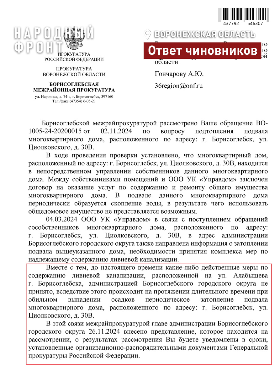 Прокурорской проверкой установлено, что многоквартирный дом на улице Циолковского, 30В «тонет» из-за фактически не работающей ливневки, проходящей по соседней улице Алабышева. Муниципалитет ее обслуживанием не занимается. Ранее Народный фронт рассказал о том, что около 4 лет после каждого сильного дождя подвал четырехэтажки затапливает. Люди не единожды обращались в городскую администрацию, где им посоветовали разбираться с подтоплением самостоятельно. Тогда жильцы дома пожаловались на прямую линию президента. После выездной проверки Народный фронт попросил прокуратуру Борисоглебска подключиться к решению проблемы.