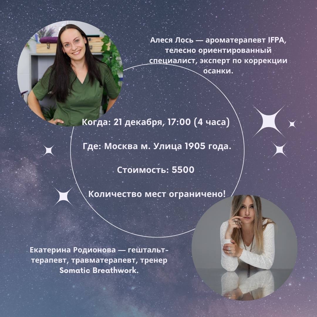 Москва, 21 декабря, 17:00 (4 часа) ✨Трансформационная сессия, чтобы освободиться от стресса и найти баланс. Что вас ждет: 🌿 Медитация с эфирными маслами для расслабления. 🌿 Самодиагностика: выбор аромата по состоянию. 🌿 Ритмичное дыхание для работы с подсознанием. 🌿 Расслабляющая медитация. 🌿 Чай и вкусняшки для заземления. Результат: ✔️ Освобождение от напряжения. ✔️ Глубокое расслабление. ✔️ Связь с телом и эмоциями. 💳 Стоимость: 5500 руб. (предоплата 2000 руб.) 📍 Место: м. Улица 1905 года. 👥 Мест ограничено! ✨ Записывайтесь: @poleznaya_krasota или по ссылке в шапке профиля #дыхание #ароматерапия #событиямосква #гармония