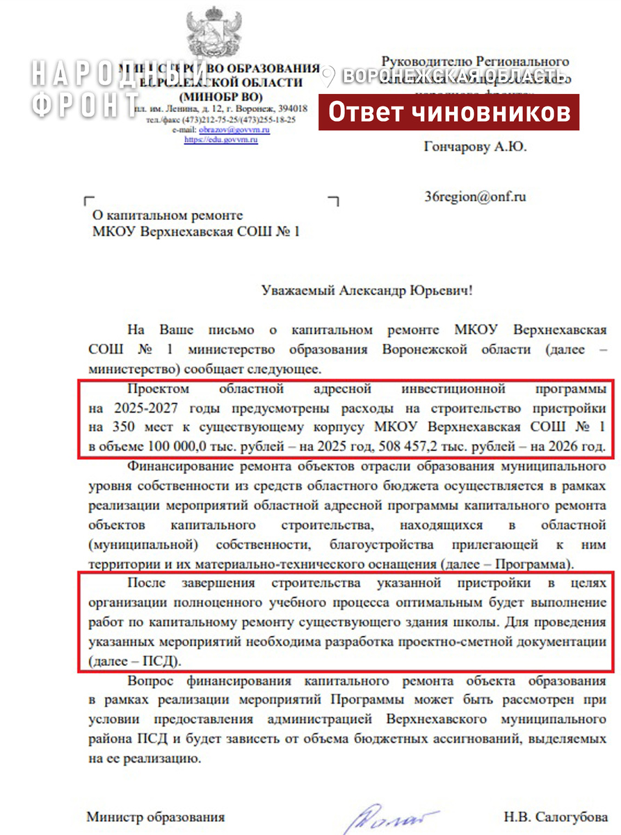 Проектом областной инвестпрограммы предусмотрено возведение пристройки на 350 мест к основному корпусу школы. Стройка должна занять два года. В следующем году на нее из регионального бюджета выделят 100 млн рублей, а в 2026 году — еще 508,5 млн рублей. Далее действующее здание образовательного учреждения планируют капитально отремонтировать. Об этом в ответ на обращение Народного фронта сообщила министр образования Воронежской области Наталья Сологубова. Ранее Народный фронт рассказал об экстремальных условиях, в которых грызут гранит знаний ученики Верхнехавской школы №1. Еще десять лет назад власти обещали решить вопрос. Однако дальше слов дело не двигалось. Родители учеников пожаловались на прямую линию президента. А Народный фронт направил обращение губернатору Воронежской области Александру Гусеву с просьбой ускорить обновление школы.