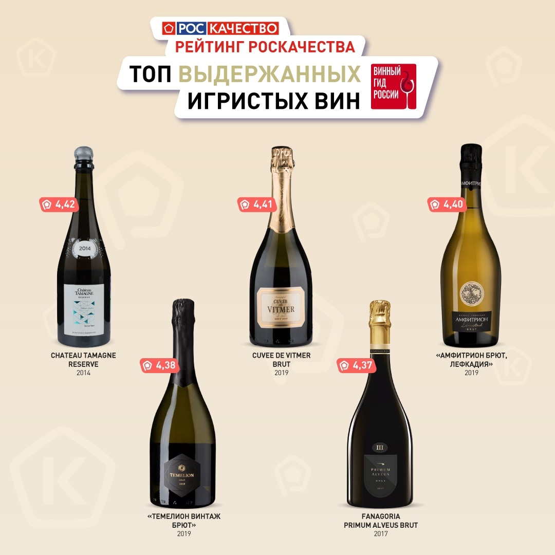 Топ-5 игристых, изготовленных классическим методом (выдержка в бутылке): 🥂 Шато Тамань. Резерв. Экстра - брют белое, 2014. 🥂 Кюве де Витмер. Блан де Блан. Брют белое, 2019. 🥂 Лефкадия. Амфитрион. Брют белое, 2019. 🥂 Лефкадия. Темелион. Брют белое выдержанное, 2019. 🥂 Фанагория Primum Alveus. Белое брют, 2017. Качество в категории игристых изначально было одним из самых высоких среди всех типов винодельческой продукции, но сейчас эксперты также отмечают позитивную динамику в этом направлении. Одобрено Роскачеством