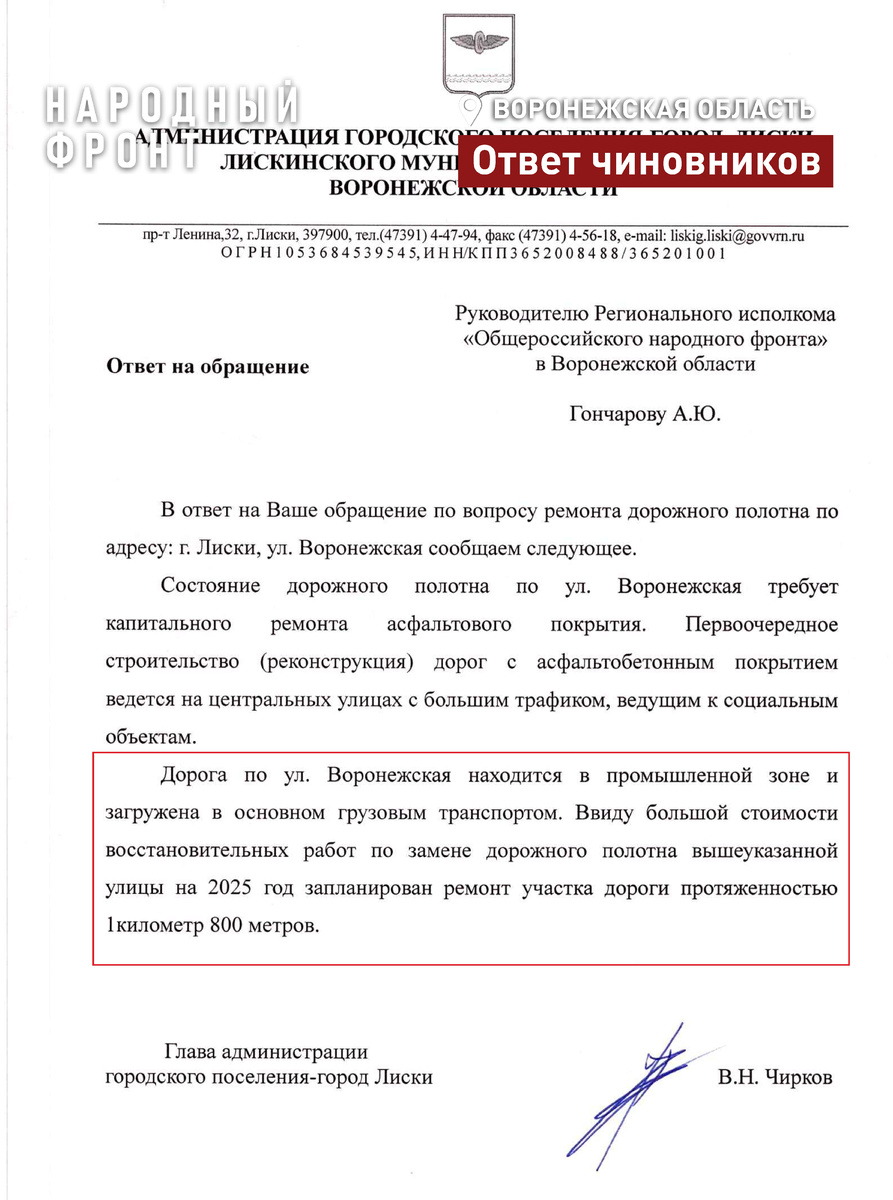 Об этом в ответ на обращение Народного фронта сообщили в муниципалитете. Перестелить асфальтовое покрытие должны на участке протяженностью 1,8 км. Общая же длина улицы около 4 км. Поэтапный ремонт объясняют значительной стоимостью работ. Надеемся, что оставшиеся 2,2 км власти тоже не оставят без внимания. Ранее Народный фронт рассказал об убитой проезжей части в промзоне районного центра, где расположено пять предприятий, на которых трудятся сотни лискинцев. Мы попросили муниципалитет запланировать обновление дорожного полотна на улице Воронежской.
