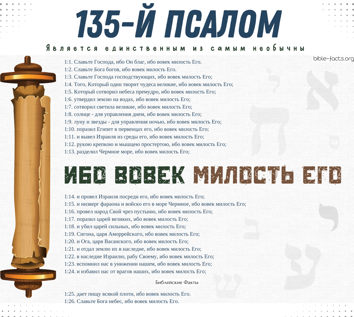 135-й псалом является единственным из самым необычным в Псалтири, потому все его стихи заканчиваются одинаково: «Ибо вовек милость Его».