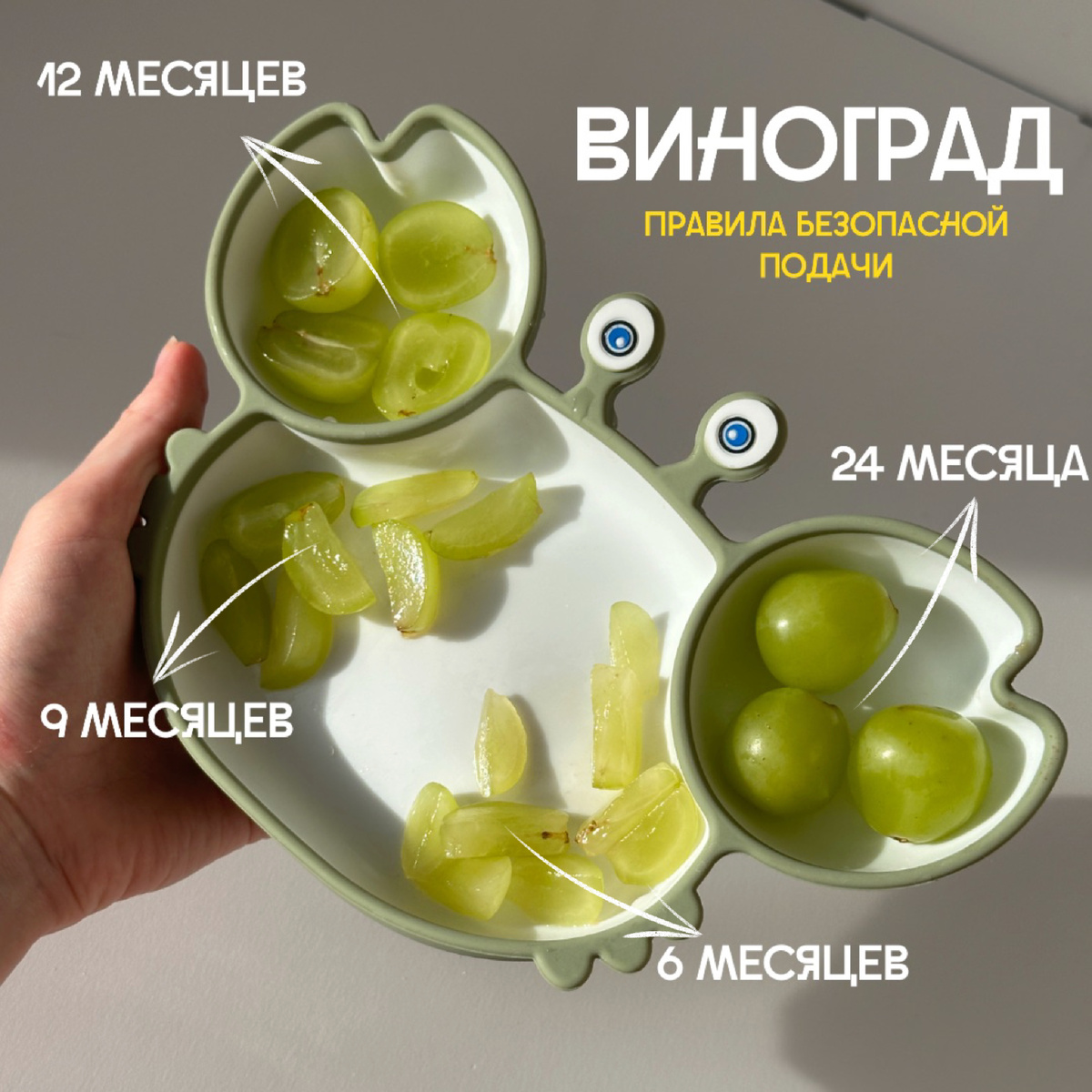 как правильно подавать виноград по месяцам: до 6 месяцев: •виноград не рекомендуется как прикорм до 6 месяцев. 6-9 месяцев - самоприкорм: •если ребенок уже пробует кусочки пищи, можно разрезать виноград на маленькие части (например, на 4-6 частей), чтобы минимизировать риск удушья и предлагать его малышу, но без кожуры. 9-12 месяцев: •разрешено давать виноград, но с осторожностью: До 12 месяцев виноград нужно подавать только в виде пюре или сока, разбавленного водой, если ребенок не аллергичен - педиатрический прикорм •если ребенок уже пробует кусочки пищи, можно разрезать виноград на маленькие части (например, на 4-6 частей), чтобы минимизировать риск удушья. 12 месяцев: •цельные ягоды можно давать разрезанными на две половинки: На этом этапе можно давать виноград, но обязательно разрезайте ягоды на 2 частей, чтобы предотвратить удушье. 24 месяца и старше: •малыш может есть виноград целиком, если он хорошо жует и не имеет склонности к удушью. общие рекомендации: • помните о