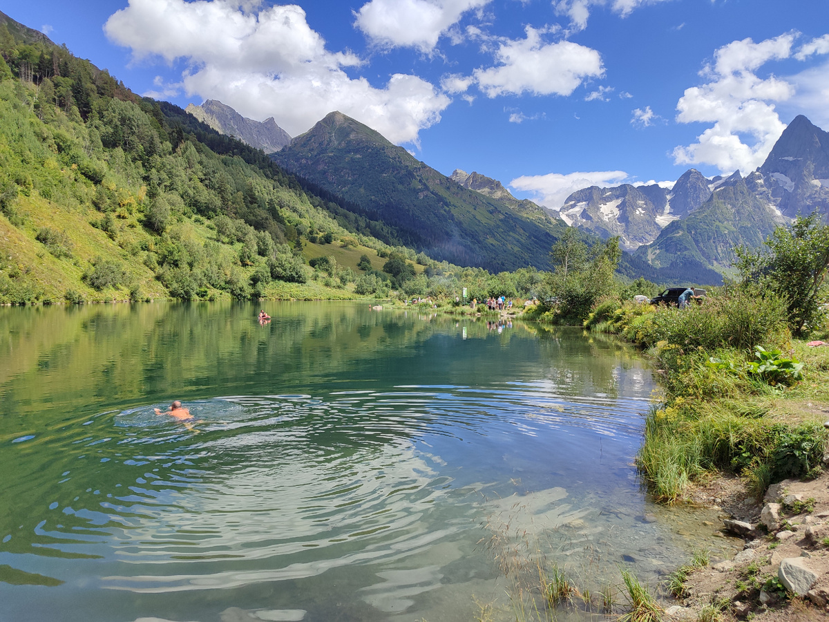 Озеро Туманлы-Кель, расположенное в живописном Гоначхирском ущелье недалеко от Домбая, является одной из самых красивых природных достопримечательностей Кавказа. Название озера переводится как “туманное озеро”, что полностью оправдывает его внешний вид — окрестные пейзажи часто окутаны густым туманом, создавая мистическую атмосферу. Географическое положение и особенности Озеро Туманлы-Кель находится на высоте 1850 метров над уровнем моря и имеет возраст около двух тысяч лет. Водоем окружен величественными горами, покрытыми густыми лесами и ледниками. Вода в озере круглый год сохраняет глубокий синий цвет, что делает его особенно привлекательным для туристов и фотографов. Флора и фауна Окрестности озера богаты разнообразной флорой и фауной. Здесь можно встретить редкие виды растений и животных, характерные для высокогорных районов Кавказа. Вода в озере холодная, даже в летний период она прогревается максимум до 20 градусов, что делает купание в нем освежающим и бодрящим. Туризм и отдых