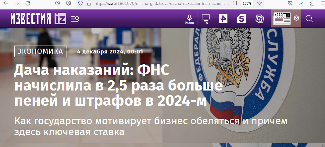Как и предсказывали ранее неглупые эксперты, в ситуации нестабильных доходов от продажи экспортных товаров за рубеж власть будет активнее использовать население страны как ресурс для добывания денег в бюджет. Судя по официальным данным, это уже происходит. Причем, как принято говорить у бюрократии, "опережающими темпами". За 10 месяцев этого года налоговая служба успела начислить гражданам и бизнесу в два с половиной раза больше (!) пеней и штрафов, чем за такой же период 2023 года. Сумма составила 783 млрд рублей - это исторический рекорд. Причин две. С января по октябрь 2024-го ставка выросла с 16% до 21% годовых. А потому и пени, по которой они рассчитываются, тоже увеличились. Многие граждане РФ, как показывают соцопросы, вообще не следят за темой изменения размеров ставки Банка России. А зря не следят. От этого зависят размеры штрафных санкций и пеней от государства. В частности, по данным ФНС, бОльшая часть начисленного объема сложилась именно за счет пеней - 735 млрд в этом году