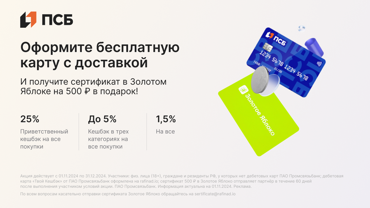 ПСБ. Сертификат на 500 ₽ на покупки в Золотое Яблоко и приветственный кешбэк 25% на все