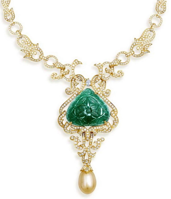 Фара Хан (Farah Khan), признанная одним из самых известных современных ювелирных дизайнеров и геммологов Индии, создает украшения, вдохновленные природой, усыпанные драгоценными камнями, часто использует резные драгоценные камни, создавая украшения для современных женщин и не теряя при этом связи с древними ювелирными традициями своей страны. В прессе Фару Хан иногда величают «Королевой изумрудов». Резные изумруды – одна из примет творческого стиля Фары. Золотое колье с крупным центральным резным изумрудом, жемчужной каплей и бриллиантами, вдохновленное украшениями индийских махарани, Farah Khan. Фара происходит из болливудской семьи, уходящей корнями в мусульманскую и парсскую аристократию, поселившуюся в Индии более 300 лет назад. Она всегда была артистичной по натуре, но после окончания факультета истории и экономики пробовала себя во многих жанрах, прежде чем нашла работу, которая стала ее призванием. В 22 года она записалась на получение степени в области геммологии и дизайна ювел