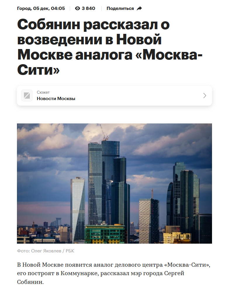 Статья с таким угрожающим заголовком опубликована на РБК. И иллюстрацию дали соответствующую. Все возбудились. Мне позвонили с радио России - просили прокомментировать. Как обычно, все важное в сообщении написано мелким шрифтом. «Сейчас мы запускаем проект, по сути дела, «Сити» для Новой Москвы в Коммунарке. Будут высотные здания по типу «Москва-Сити», но чуть пониже», — передает его слова ТАСС. При этом, как отметил Собянин, несмотря на меньшие по размеру строения по сравнению с деловым центром «Москва-Сити», новый деловой центр все равно сможет обеспечить достаточно большое количество рабочих мест. Достаточно большое - это 950. Не тысяч... А просто девятьсот пятьдесят штук. А площадь этого "чуть пониже" будет 12 000 квадратных метров. Что эквивалентно площади ТРЕХ обычных хрущоб 4-х подъездных, одной 20-этажной башни современной или 2 советских 12-этажек... Для сравнения, площадь ТЦ Саларьево наверное 60-80 тысяч метров. Короче, Сергей Семенович собирается построить в Новой Мос