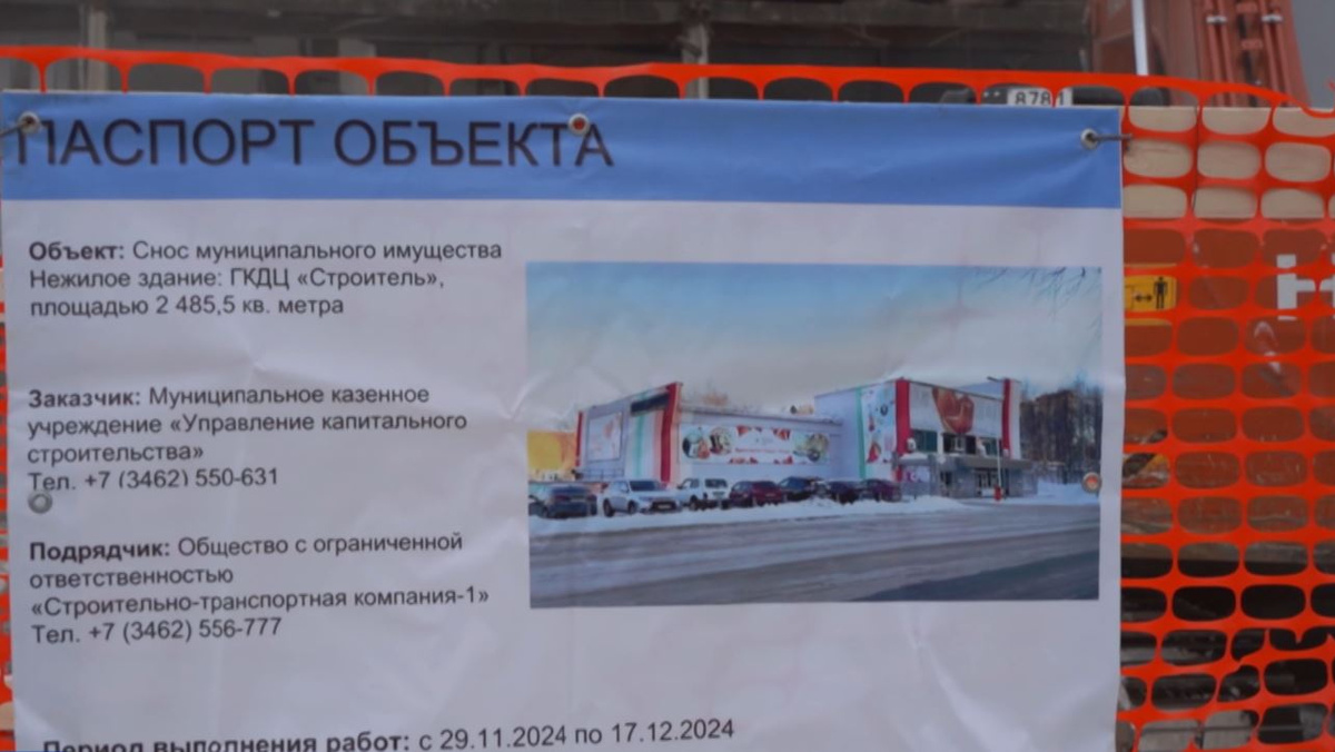 Объект небезопасный, находиться в нем людям категорически запрещено. Здание старейшего учреждения культуры в Сургуте пошло под снос. На глазах у горожан уходит эпоха. Городской культурный центр был открыт в 1969 году, но признан аварийным. Обследование показало разрушения несущих конструкций. Здание не подлежит ремонту. Из-за аварийного состояния цент закрыт с прошлого года. Творческие коллективы переехали в другое помещение. Подрядная организация по условиям контракта должна завершить работы по сносу здания до конца декабря. На объекте будет задействовано более десяти единиц техники. Шуметь подрядчики обещают только днем, чтобы не доставлять неудобств жителям. В ночное время на площадке будет дежурить охрана. Решение о том, что появится на этом месте, городские власти примут с учетом мнения сургутян и архитектурно-художественного совета. «Конструктивные элементы здания, которые несут нагрузку, в аварийном состоянии. Данный факт не допускал нахождения людей на объекте, поэтому принято
