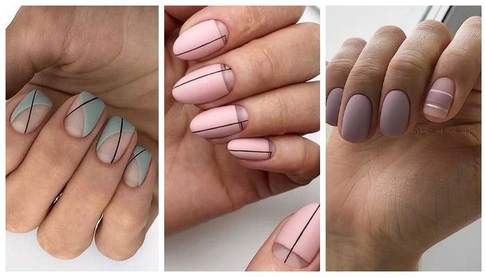 Нейл индустрия не стоит на месте и непрерывно развивается, предлагая женщинам всех возрастов разнообразные и оригинальные идеи для маникюра. В этой статье мы рассмотрим дизайны с изящной геометрией. Модный маникюр на каждый день можно создать с помощью асимметричного узора, геометрических форм и глянцевого покрытия. На светло-персиковом фоне особенно хорошо смотрятся белые полоски, но их также можно заменить на чёрные, чтобы добавить маникюру индивидуальности и выразительности. Трендовый лавандовый + нюд + матовый топ + черные полоски — такого рода маникюр шикарно подойдет квадратной форме ногтей. Геометрия в дизайне ногтей пользуется популярностью уже достаточно долгое время и интерес к ней не угасает. Обратите внимание, как классическое однотонное покрытие белого цвета с перламутровым блеском преобразилось за счет нескольких темных полосок. Такой дизайн не займет много времени и усилий, а в результате выглядит он просто феерично. Белый цвет лака , объединив с черными полосками вы пол