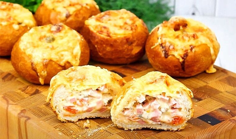 Ингредиенты (на 6 штук): 🔸Булочки - 6 шт. 🔸Колбаса (ветчина) - 300 г 🔸Сыр - 200 г 🔸Помидор - 200 г 🔸Оливки (без косточек) - 100 г 🔸Майонез - 2 ст. л. 🔸Соль, специи - по вкусу 🔸Зелень - по вкусу Приготовление пошагово: 1️⃣У булочек срезать верхнюю часть и вынуть мякиш так, чтобы получились корзинки, оставляя не слишком тонкие стенки. 2️⃣Колбасу, оливки и помидор нарезать небольшими кусочками. 3️⃣Сыр натереть на средней терке. 4️⃣В миске соединить нарезанные колбасу, помидор, оливки и натертый сыр (немного оставить сыра для посыпки сверху). 5️⃣Добавить по вкусу майонез, соль, перец и специи. Все хорошо перемешать. 6️⃣Заполнить булочки начинкой (примерно по 1,5 ст. л.), сверху посыпать натертым сыром. 7️⃣Выложить булочки на противень с пергаментной бумагой и запекать в заранее разогретой до 180 градусов духовке примерно 15 минут, чтобы расплавился и зарумянился сыр. #завтраки #завтрак #булочки #булочкисначинкой #назавтрак Кухня с Викторией Мирошниченко - готовим с Викторией Миро