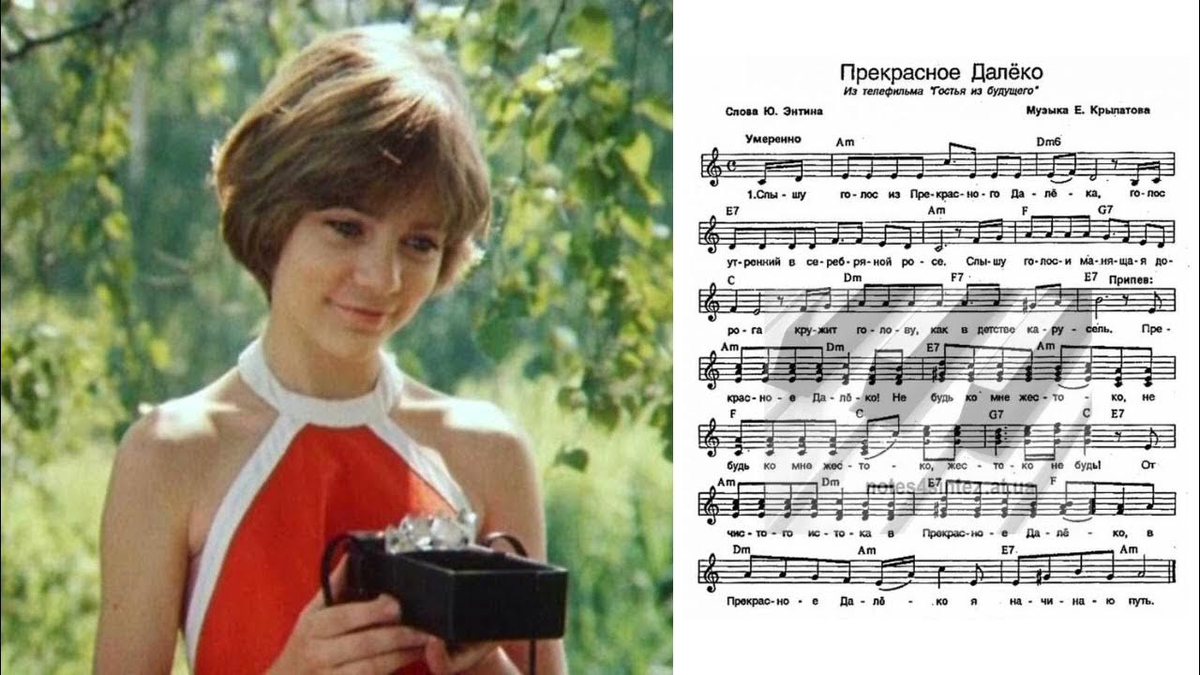 Музыка композитора Евгения Крылатова, стихи поэта Юрия Энтина. Песня стала популярной после выхода фильма "Гостья из будущего" в 1985 году, где она прозвучала впервые. --------------------------------------------------------------------------------------------- Слышу голос из прекрасного далёка,