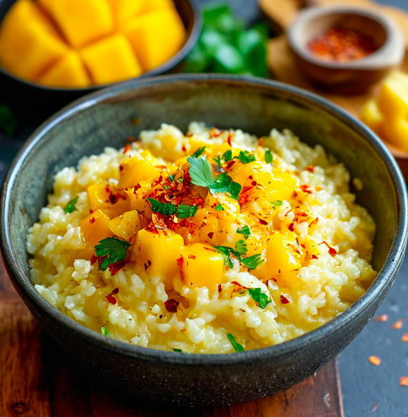 Ризотто — это классическое итальянское блюдо, известное своей кремовой текстурой и богатым вкусом. Однако сегодня мы приготовим необычную вариацию, добавив в него экзотические нотки кокоса и манго. Это блюдо идеально подходит для тех, кто хочет попробовать что-то новое и необычное. - 1½ стакана риса арборио - 400 мл кокосового молока - 500 мл овощного бульона - 1 большое манго, очищенное и нарезанное кубиками - 1 луковица, мелко нарезанная - 2 зубчика чеснока, измельченных - 2 столовые ложки оливкового масла - ½ чайной ложки сушеного чили - Соль и черный перец по вкусу - Свежая кинза для украшения - Сок половинки лайма - Начните с подготовки всех ингредиентов. Очистите и нарежьте манго, мелко нарежьте лук и измельчите чеснок. - Разогрейте оливковое масло в большой сковороде или кастрюле на среднем огне. Добавьте лук и готовьте, помешивая, пока он не станет мягким и полупрозрачным, около 3-4 минут. - Добавьте измельченный чеснок и сушеный чили, продолжайте готовить еще 1 минуту, чтобы а