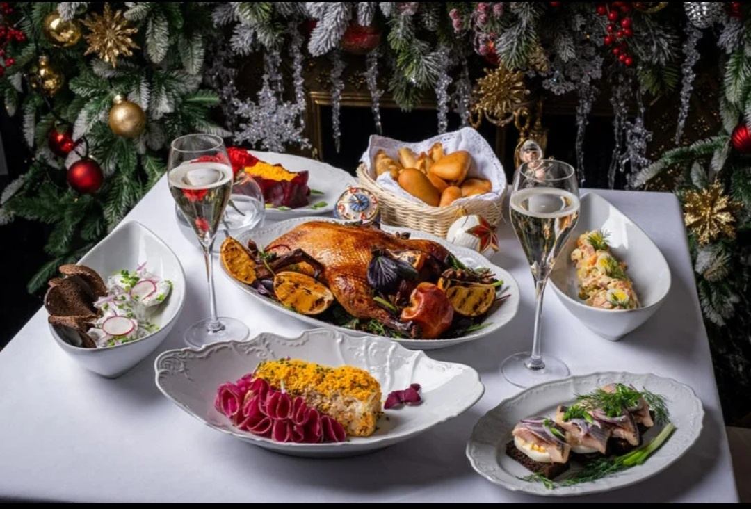 Топ 10 блюд для новогоднего стола. 1.«Оливье». Классический салат, без которого не обходится ни одно праздничное застолье. Для приготовления нужно смешать отварной картофель, консервированный зелёный горошек, солёные огурцы, отварные яйца, колбасу и майонез. 2.«Селёдка под шубой». Популярный салат, который можно приготовить как в большом салатнике, так и сделать порционным. 3.«Бутерброды с красной рыбой и сливочным сыром». Для приготовления чаще всего используют слабосолёную сёмгу или форель. 4.«Яйца, фаршированные красной икрой ». Закуска из яиц, фаршированных красной икрой, вкуснее и оригинальнее. 5.«Заливная рыба ». Праздничная закуска, вкус которой зависит не столько от рыбы, сколько от правильно сваренного бульона. 6.«Холодец». Приготовление этого блюда требует много времени и сил. 7.«Запечённая курица». Чтобы образовалась аппетитная хрустящая корочка, перед началом приготовления нужно промыть тушку и тщательно вытереть насухо бумажным полотенцем. 8.«Мясной рулет с черн