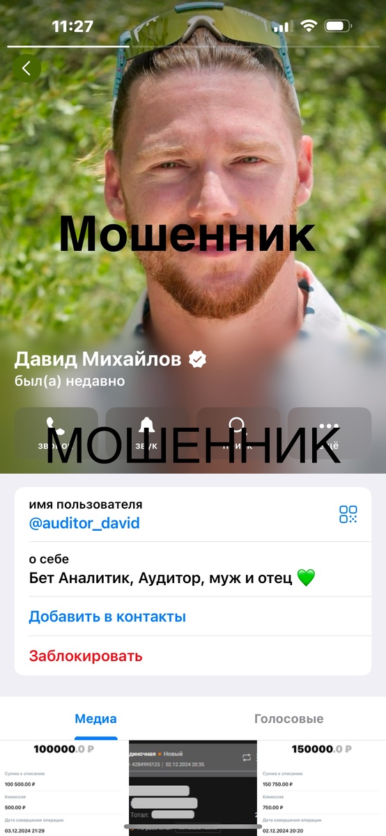 Как я стала жертвой мошенника Давида Михайлова. Аудитор ВЕТ. Без долгих предисловий хочу уберечь людей от мошенника на чей канал была подписана несколько месяцев как на эксперта по «ставкам на спорт» Вчера 04.12.2024 Давид обманным путем, введя меня в заблуждение, завладел крупной денежной суммой, а именно 300 тысяч рублей. Сегодня он меня заблокировали отправил в бан. Сегодня я узнала, что не только я пострадала в его мошеннической схеме. все скрины оплат и переписок у меня есть и прилагаются. Схема обмана такова. 02.12.2024 года Давид Михайлов в своем Телеграм канале объявляет о том что он владеет инсайдерской информацией о беспроигрышных матчах которые состоятся 2,6 и 10 декабря. Давид диктует условия по которым обещает выигрыш по коэффициенту 2.31 НО что это за матчи он раскрыть не может. И кто желает поучаствовать и поставить на матч должны перечислить ему сумму от 2 до 800 тысяч рублей и он сам поставит эти деньги на матч, а после выигрыша вернет х 2.21 за вычетом его интереса