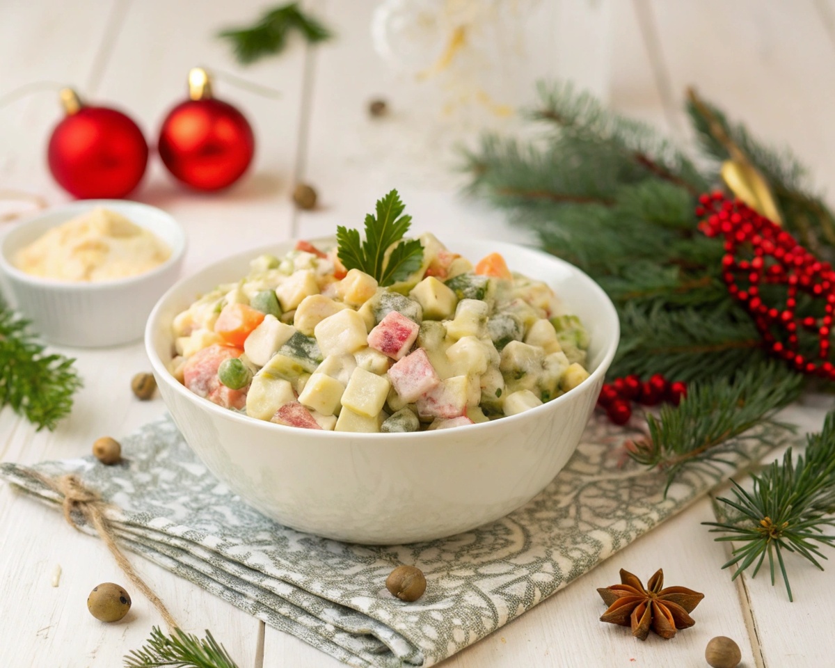 Салат оливье — это не просто блюдо. Это символ, вкус праздника, боя курантов и ожидание чуда на одном большом праздничном столе. Для меня оливье всегда связан с Новым годом. Это традиция из детства, которую хочется повторять снова и снова. Но как так получилось, что именно этот салат стал нашим главным праздничным атрибутом? Давайте разберёмся. Началась история оливье в середине XIX века. Его создатель, французский шеф-повар Люсьен Оливье, работал в московском ресторане «Эрмитаж». В оригинальном рецепте были: рябчики, раковые шейки, каперсы, оливки и соус на основе французского майонеза. Это блюдо считалось роскошным и символизировало изысканный вкус эпохи. Но время шло, и ингредиенты заменялись на более доступные. Вместо рябчиков — курица или колбаса, вместо каперсов — солёные огурцы, вместо раковых шеек — варёная морковь и картофель. Майонез, конечно, остался — куда же без него! Так из аристократического блюда оливье превратился в символ народного Нового года. Тут всё просто: в совет