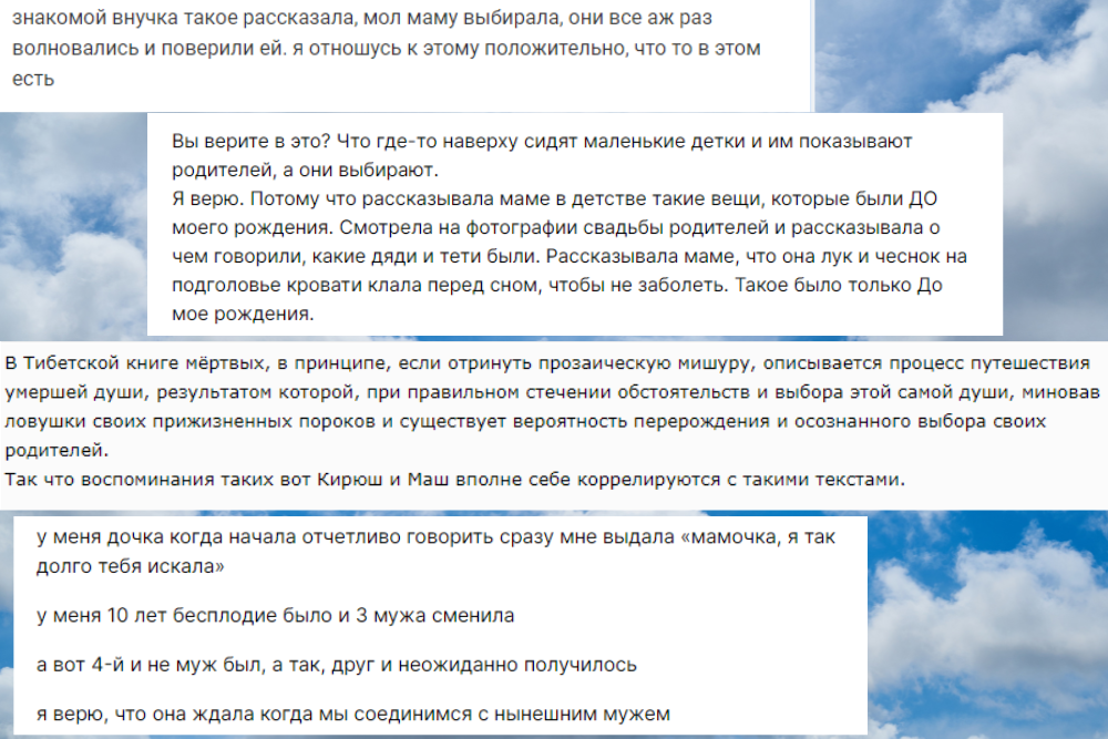 Для кого-то эта статья покажется полным бредом, кто-то вдруг вспомнит слова своего ребенка и увидит связь, а кто-то и вовсе уже был знаком с этой темой и может поделиться уточнениями. Мои слова никак не проверить, но есть очень много случаев, когда дети в раннем возрасте могут рассказывать похожие вещи про то как видели знакомство родителей, во что они были одеты, что говорили. Кто-то рассказывает, что была возможность выбора семьи. Специально для своей статьи я прошерстила форумы и нашла много разных историй и мнений на эту тему. Считается, что душа ребенка в первую очередь выбирает отца, а затем уже мать. То есть подыскивает женщину уже имеющемуся папе. Поэтому бывает так, что когда женщина с одним мужчиной, ребенок не приходит, хотя с медицинской точки зрения все отлично. А как только она находит другого мужчину, беременность случается прям тут же без каких либо проблем. Не могу утверждать каким именно образом происходит выбор души, кто-то говорит, что она словно летает вокруг нас и