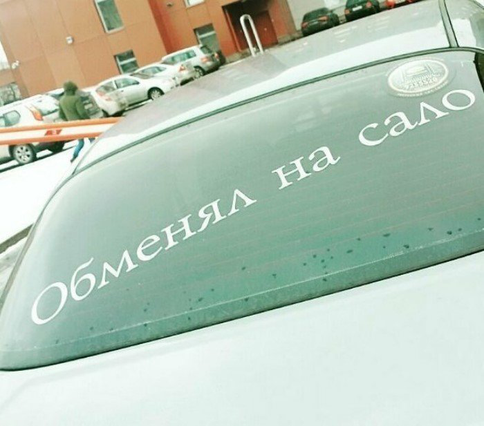 Народное творчество безгранично. Автолюбители стараются свои «ласточки» выделить не только перед соседом, но и в потоке на трассе. Не хватает народным умельцам вполне законных наклеек, многие стараются поразить гениальными надписями. Делится народ событиями, которые так и рвутся наружу, а выразить их, кроме как на своем авто, и негде. Видимо, отправленный паблик в соцсети не будет иметь такой силы, как рвущая душу надпись на машине, пусть и со всеми нарушениями закона. №1. Открывает ТОП сообщение о свободе купли, продажи и обмене. Хорошо и далеко видны на тонировке белые буквы. Но это точно до встречи с инспектором. Остановят в пути и, обязательно заставят очистить окна от пленки. Сдирать тонировку очень трудоемкая работенка. №3. Муж выставил на всеобщее обозрение водительские способности супруги. Еще не известно, как сам управляет машиной. Пока не доказано, что женщины за рулем, угрожают движению на дороге. №4. В этой надписи отразился крик души, защищающий китайский автопром и собс
