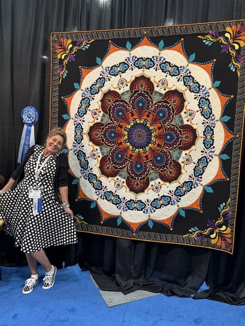 Добрый день, дорогие друзья и любители лоскутного шитья. Если бы сейчас я снимала видео о том, что хочу рассказать вам сегодня, то, наверное, в первых кадрах прозвучала бы барабанная дробь и звук фанфар. Та-та-там! Встречайте! Kyra Reps и ее победоносный квилт под названием "Следопыт"! Эта большая и красивая работа завоевала премию "За традиционное мастерство" (5 000$) на Хьюстонском фестивале 2024 года. Однажды я уже рассказывала о невероятных "точечных квилтах" этого автора, рекомендую посмотреть это видео тем, кто еще не видел, а сегодня просто напомню, что Kyra - большая любительница аппликации с закрытым срезом, в особенности маленьких кругляшков из ткани. В этом квилте их 3 133 штуки. Вы можете себе представить?! На изготовление этого одеяла она потратила три года своей жизни, из них 180 часов только на стежку. При этом она много работала и занималась параллельно еще пятью другими проектами. "Боже мой, как только люди все успевают?) «Каждая мандала уникальна, как и человек, кото