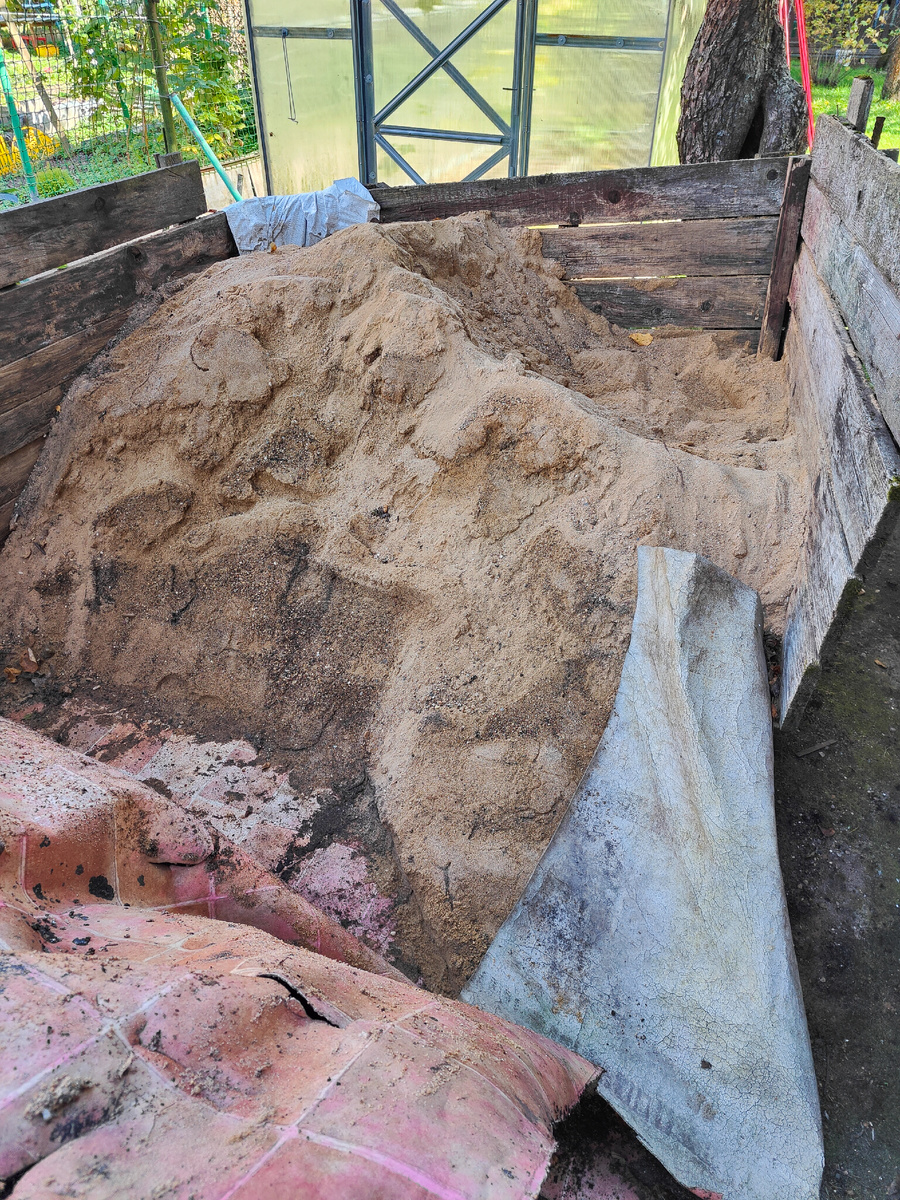 На даче за домом есть у нас большая куча песка для хозяйственных нужд. На участке песок всегда нужен: новую дорожку проложить, для дренажа при посадке многолетников; для улучшения структуры почвы на огороде; приготовить смесь для окучивания роз и клематисов на зиму; для выравнивания участка; для пескования газонов и ещё много для чего. Однажды при создании нового цветника не хватало земли, так пришлось вместо неё внести песок, в результате почва там получилась супесчаная. Чтобы куча песка занимала меньше места, для неё соорудили что-то вроде короба. С трёх сторон - стены из досок, а с четвертой - куча прикрыта куском старого линолеума. В конце сентября понадобилось уменьшить площадь под кучей. Решили сложить песок покомпактнее. Откинули линолеум, а там... Присмотритесь получше. Ничего не замечаете? Для тех, кто ничего подозрительного не усмотрел, показываю, на что обратить внимание. Под линолеумом оказалось лягушачье общежитие. Они облюбовали кучу песка для своих зимних норок. Уже уст