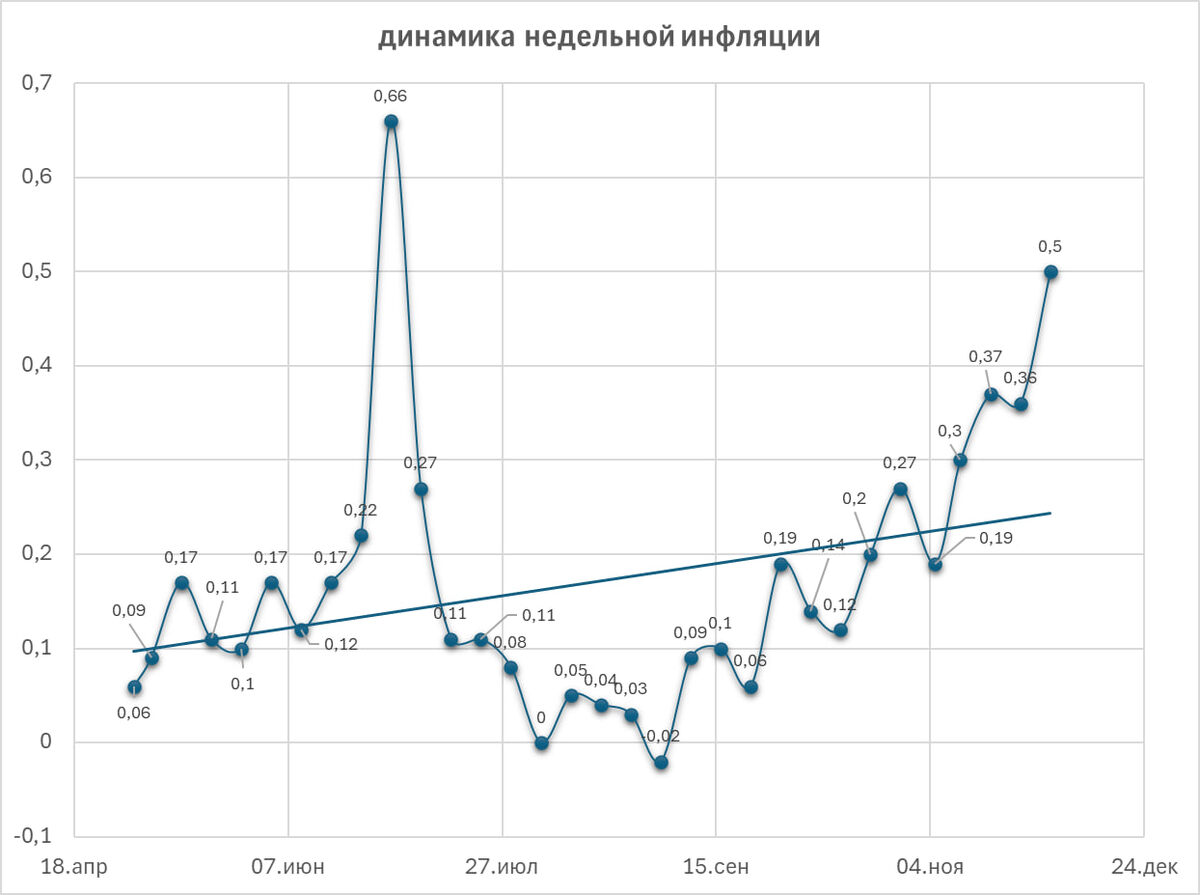 Во вчерашних данных от Росстата по недельной инфляции снова разочарование. Инфляция не то что ускоряется, а ускоряется очень быстро. Итак, за неделю с 26 ноября по 2 декабря темпы роста цен существенно выросли до 0,5%. И этот рост произошел после повышенного темпа за предыдущие 2 недели, где они составили 0,36% и 0,37% (это отражено на графике «Динамика недельной инфляции»). Предварительные итоги ноября очень разочаровывают. Темпы инфляции в годовом выражении составили 18,37%. За месяц цены вросли на 1,51%, а среднесуточный прирост цен составил 0,05% — это очень много. В итоге ноябрь поставил рекорд по темпам инфляции в этом и прошлом году. Даже в июле, на фоне повышения тарифов ЖКХ, среднесуточный прирост цен был ниже — 0,038%. Исходя из полученных данных, в ноябре мы снова увидим рост годовой инфляции, т. к. в ноябре прошлого года среднесуточный рост цен составил 0,037%, а в ноябре этого года 0,05%. Ждем финальных расчетов итогов ноября. А если говорить про темпы инфляции в годовом