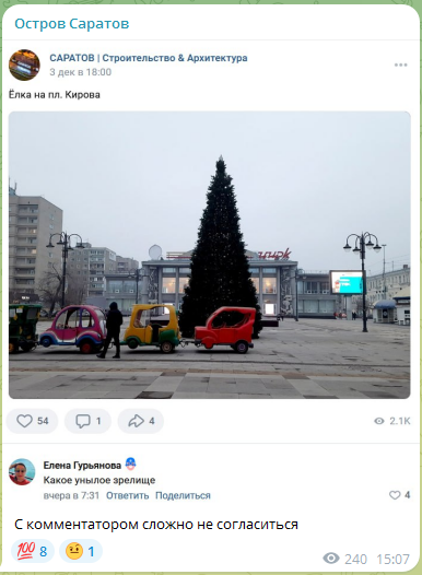 ... Встретил сегодня одного знакомого, с которым общался годом ранее. Он обвинил меня в том, что я пишу только о том какой Саратов хороший и красивый. "Наш Саратов - унылое г...! - эмоционально произнес он, матерно жестикулируя при этом. - Вот в ... телеграм каналах правду пишут (он назвал парочку известных). А ты как ушел в лагерь зла, так стал писать розовую муть!". Я не стану писать названия каналов, о которых он говорил, не буду называть имени той, с кем я общался последние пару лет и чей канал администрировал. Просто этот человек один из тех, кто всегда говорил только о том, что Саратов - дыра, из которого нужно "рвать когти". Переубеждать такого рода людей не имеет смысла - не поможет. Проверено. Я пишу так, как считаю нужным и правильным. Ведь это "Моя саратовская жизнь", а не их. И комментарии подобного рода, как на картинке ниже, меня коробят. Сегодня вечером я пробежался по центру со стареньким фотоаппаратом и немного поснимал как украсили Саратов к новому году. Предупреж