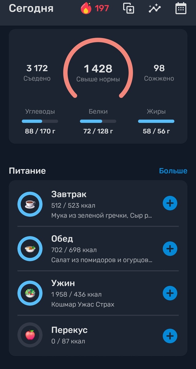 Здравствуйте. Даже не знаю с чего начать. Я весь день с больной головой лежала в кровати. Вечером робко промяукала из под одеяла мужу что хочу чего-то вкусного и японского. Он мне заказал. Я выползла из кровати на запах еды и очень вкусно поела. Роллы были великолепны а еще был суп с мясом, яйцами и шпинатом. Лежу потом, довольная, и говорю ему, мол дай посмотреть где заказал, для приличия забью все таки в счетчик. Ну будет там перебор на 200 ккал, что такого. На ужин я себе оставила 550 ккал. Короче зашла я на сайт ресторана... И увидела что я поужинала на 2000 ккал 😂😂😂 Мне так вкусно было, вы не представляете) В счетчик просто вбила итоговую цифру ужина по ккал, бжу выписывать не стала) Вот итог за день 😅 А вот активность)) Завтра вернусь в обычный режим, а сегодня вот такие дела) Едем дальше!