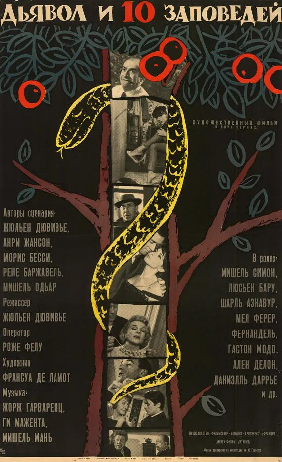 Цитата в заголовке взята из одного из самых популярных фильмов во Франции 1960-х. Это чёрная комедия "Дьявол и десять заповедей" (1962) режиссёра Жюльена Дювивье с мегазвёздами французского кино — тут и совсем зелёный Ален Делон, и Луи де Фюнес, и Фернандель, и Шарль Азнавур.