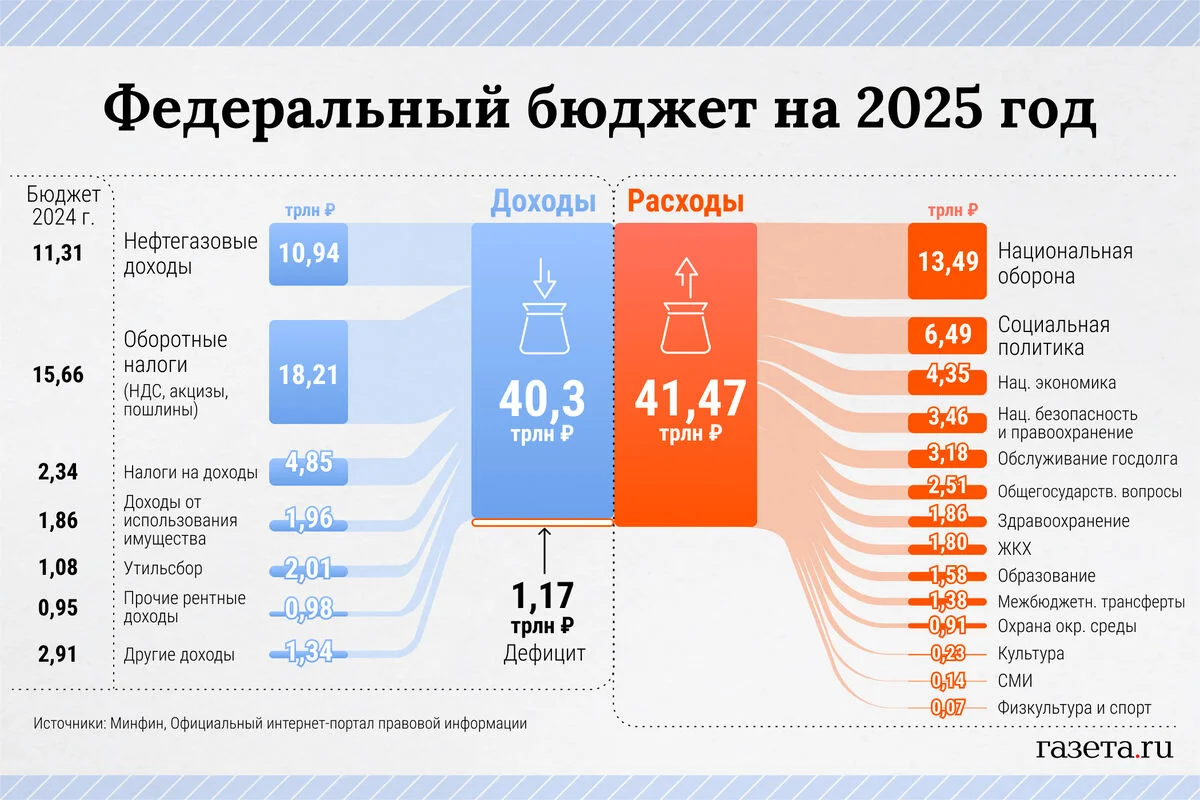 Прогнозируемые доходы бюджета составят 40,3 трлн рублей, расходы — 41,47 трлн рублей. Почти треть всех трат уйдет на оборону, также в числе основных расходных статей — социальная политика и национальная экономика. Из чего состоит российский бюджет на следующий год — в инфографике «Газеты.Ru».