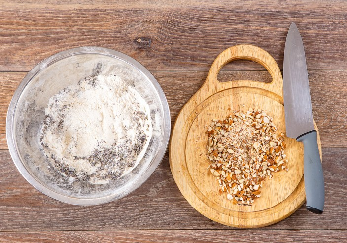 Шаг 1 Разогрейте духовку до 180°С. Миндаль нарубите мелко. В миску просейте 240 г муки,разрыхлитель, всыпьте лаванду, миндаль и щепотку соли, перемешайте. Шаг 2 В сотейник положите сливочное масло (оставьте немного масла на смазывание формы) и растопите его на слабом огне. Одно яйцо разделите на белок и желток, белок положите в миску (желток не понадобится). В миску к белку разбейте два яйца, всыпьте сахар и взбейте миксером на максимальной скорости в течение 2 минут, затем влейте ванильный экстракт, влейте тонкой струйкой растопленное сливочное масло, продолжая взбивать миксером ещё 1 минуту. 2 мин Шаг 3 В миску к яичной смеси всыпьте 1/3 мучной смеси, влейте 40 мл сливок (4 ст. ложки), 1 ст. ложку холодной воды, перемешайте миксером на средней скорости 30 секунд, повторите действие в такой же последовательности ещё 2 раза. Форму для запекания смажьте оставшимся сливочным маслом, посыпьте 24 г муки, влейте тесто, поставьте запекаться в разогретую духовку и выпекайте в течение 30 минут
