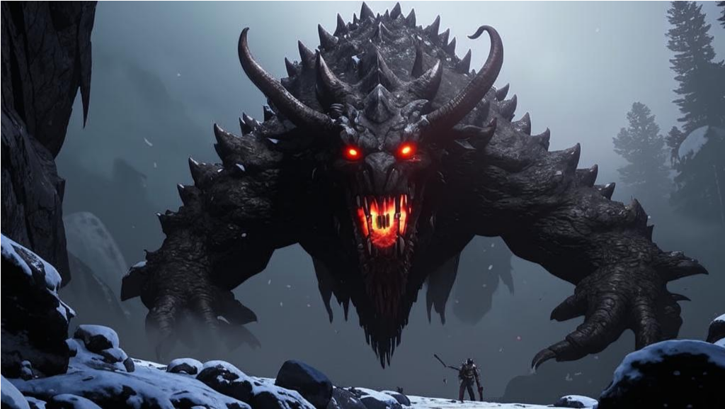 Горажут — огромный и угрожающий, он словно сливается с дикой, неприступной природой этих суровых гор. Его тело кажется частью самого камня, покрытое серо-чёрной шершавой кожей, словно обветренной тысячелетними ледяными бурями.