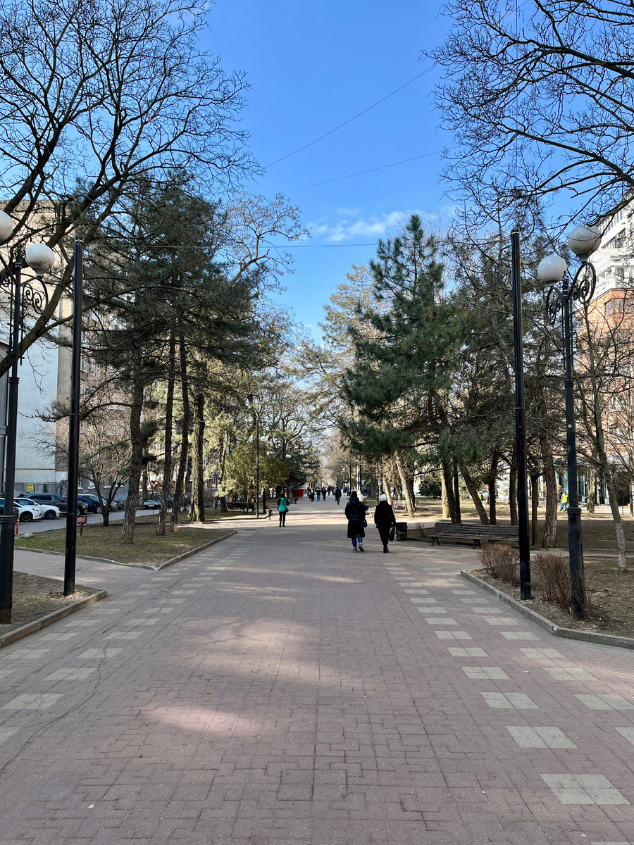1. На самом деле исключительно пешеходная улица только на участке от Театрального проспекта до проспекта Чехова, это примерно 2/5 общей длины, но широкий тенистый бульвар есть на всей её протяжённости. Выглядит Пушкинская как-то так: