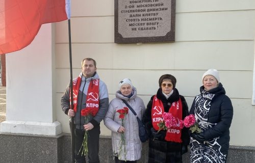 Коммунисты Долгопрудного возложили цветы к памятной доске на Площади Собина, установленной в честь коммунистов 2-ой Московской стрелковой дивизии, которые в этом здании 28 ноября 1941 года дали клятву «Стоять насмерть. Москву врагу не сдавать!». Помним наших героев и славим воинов-освободителей! Приняли участие в городском митинге у мемориала Скорбящая Мать, почтили участников контрнаступления под Москвой минутой молчания и возложили цветы! Мы единственные, кто был с красным флагом, с которым шли наши советские войска в бой! Позор нашей власти, которая сторонится и всячески обходит всё советское — красный флаг и старается стереть из памяти потомков то, что под руководством коммунистической партии была одержана победа в Великой отечественной войне! Уверены, пройдет это смутное время и всё встанет на свои места! Да здравствует власть Советов! Мы прошли далее к памятнику матросу Железнякову в Центральном парке, где раздавали газету «Подмосковная правда» и поздравляли жителей с Днём советс