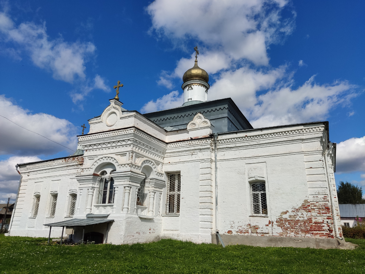 После внешнего осмотра здания усадьбы Голицыных и парка мы с другом Александром решили ехать домой. Но, спустившись к дороге, я указал своему товарищу на церковь, что красиво стояла на холме через речку. Сколько не торопился Саня вернуться в Переславль по делам, но небольшой крюк сделать согласился. Сразу за главной дорогой села Сима (улица Багратиона) есть мост через местную речку Симка, но мост этот только для пешеходов. Мы же не захотели оставлять наших железных коней без присмотра надолго, поэтому свернули направо, чтобы объехать часть речки и подобраться к искомой церкви с севера. Свернув направо, мы поехали в сторону Юрьев-Польского до развилки, затем свернули с главной дороги налево, на улицу Советскую, что должна была привести нас к церкви. На середине Советской мы привлекли внимание местных собак, которые решили нас приветствовать самым активным лаем и игрой в догонялки. Особенно старался один крупный чёрно-белый Полкан (автор точной клички оппонента не знает, но выглядел этот