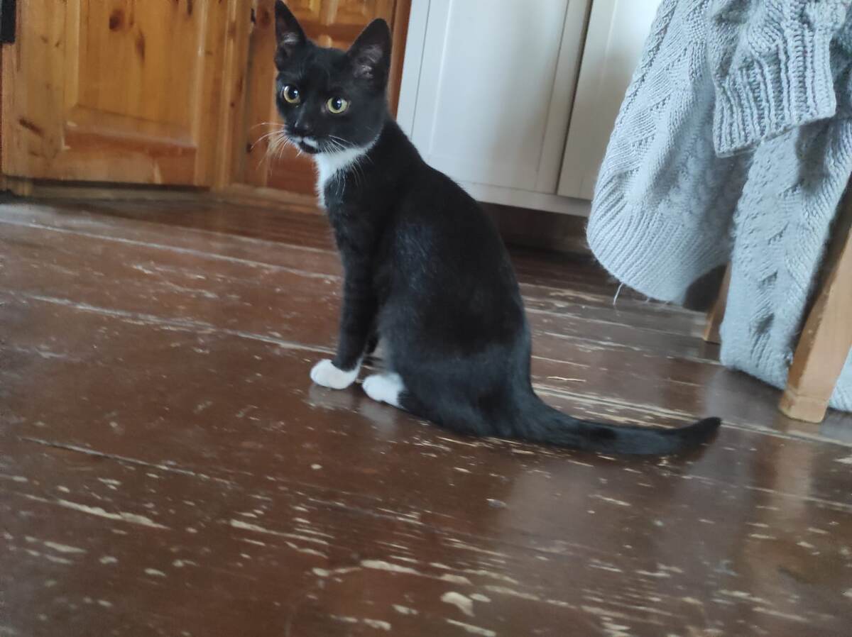 Котенок (кошка) по имени Уси-Пуси. Зовем просто Уся за необычные усы — две белые полоски над верхней губой. Уся родилась 4-5 месяцев назад на даче у соседей, которые переехали на зиму в Москву. У Уси очень стильный и нарядный черно-белый образ — белые перчатки на всех лапах, манишка и галстук. За это мы сначала звали ее фрейлиной. Была такая фрейлина при дворе российских царей, Наталья Петровна Голицина, которую прозвали «усатая княгиня». Она слыла красавицей, но имела усы. По легенде она послужила Пушкину прототипом «пиковой дамы».