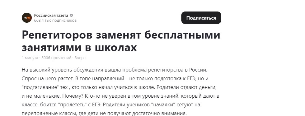 "Родители вынуждены тратить деньги на платные услуги репетиторов, которые зачастую - сами учителя либо те, кто уходит из учителей в самозанятость. И тут надо думать над повышением качества образования в школе, - цитирует Чернышенко (вице-премьер РФ) ТАСС. - Мы планируем заменить это бесплатными услугами, чтобы дети могли сдавали ЕГЭ без привлечения платных специалистов".