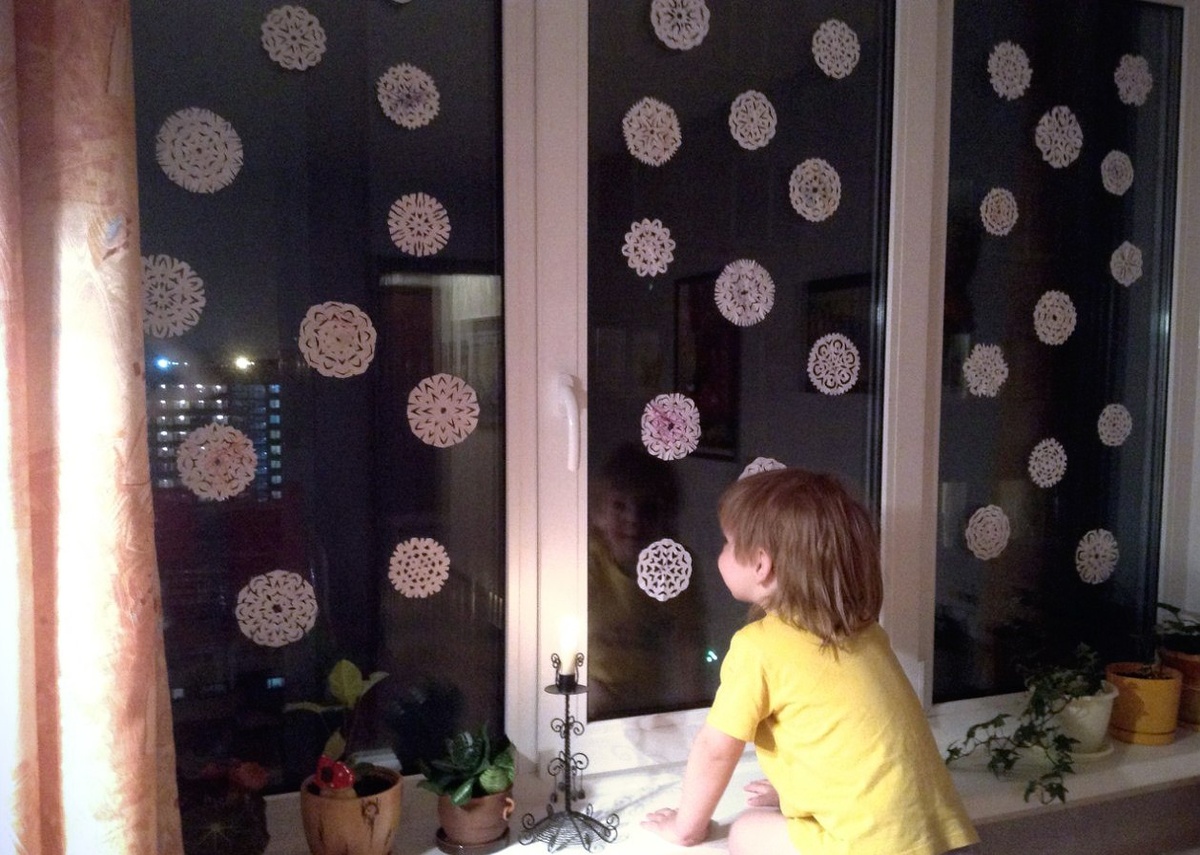 Мы вместе с трёхлетним Андрюшей развесили снежинки на окнах. Вечерами заползал на подоконник и зачарованно разглядывал!