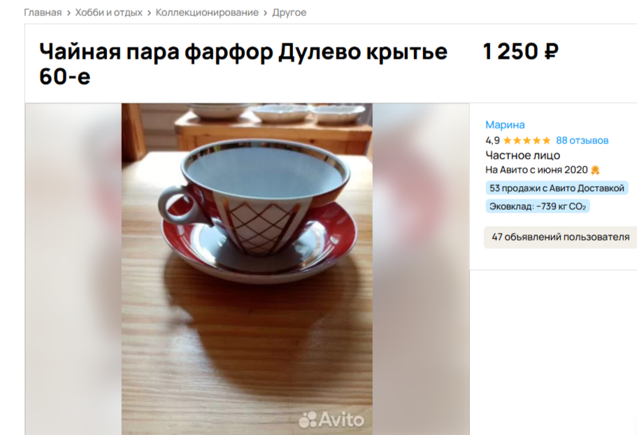Когда я ее продавала, ну как всегда попросили скидку. Учитывая мою скидку и процент Авито, я потеряла 400 рублей, как если бы чайную пару забрали самовывозом.