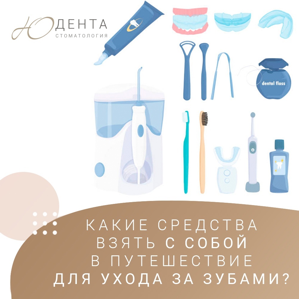 Многие отправляются в поездки и путешествия, и последнее, о чем человек задумывается в приятных хлопотах перед долгожданным отдыхом, — это гигиена полости рта. Первое и самое главное – нужно заранее, ещё до отъезда, посетить стоматолога, даже если в данный момент проблем с зубами у вас нет. Даже если вы уверены, что с зубами у вас всё в порядке –подкрепите свою уверенность визитом к специалисту. После сеанса у специалиста, можно собирать чемодан, что же нужно взять с собой в отпуск? 🔸 Зубная щётка В путешествиях лучше использовать зубную щетку с защитным колпачком. Он предохранит щетинки щетки от контакта с окружающей средой, а вас – от чужеродных бактерий. 🔸 Зубная нить Ежедневно пользоваться зубной нитью. При неэффективной гигиене полости рта после каждого приема пищи образуется зубной налет, который приводит к появлению кариеса. Компактный размер упаковки зубной нити позволяет всегда брать ее с собой. 🔸 Зубная паста Обязательно возьмите с собой зубную пасту, которой пользуетесь