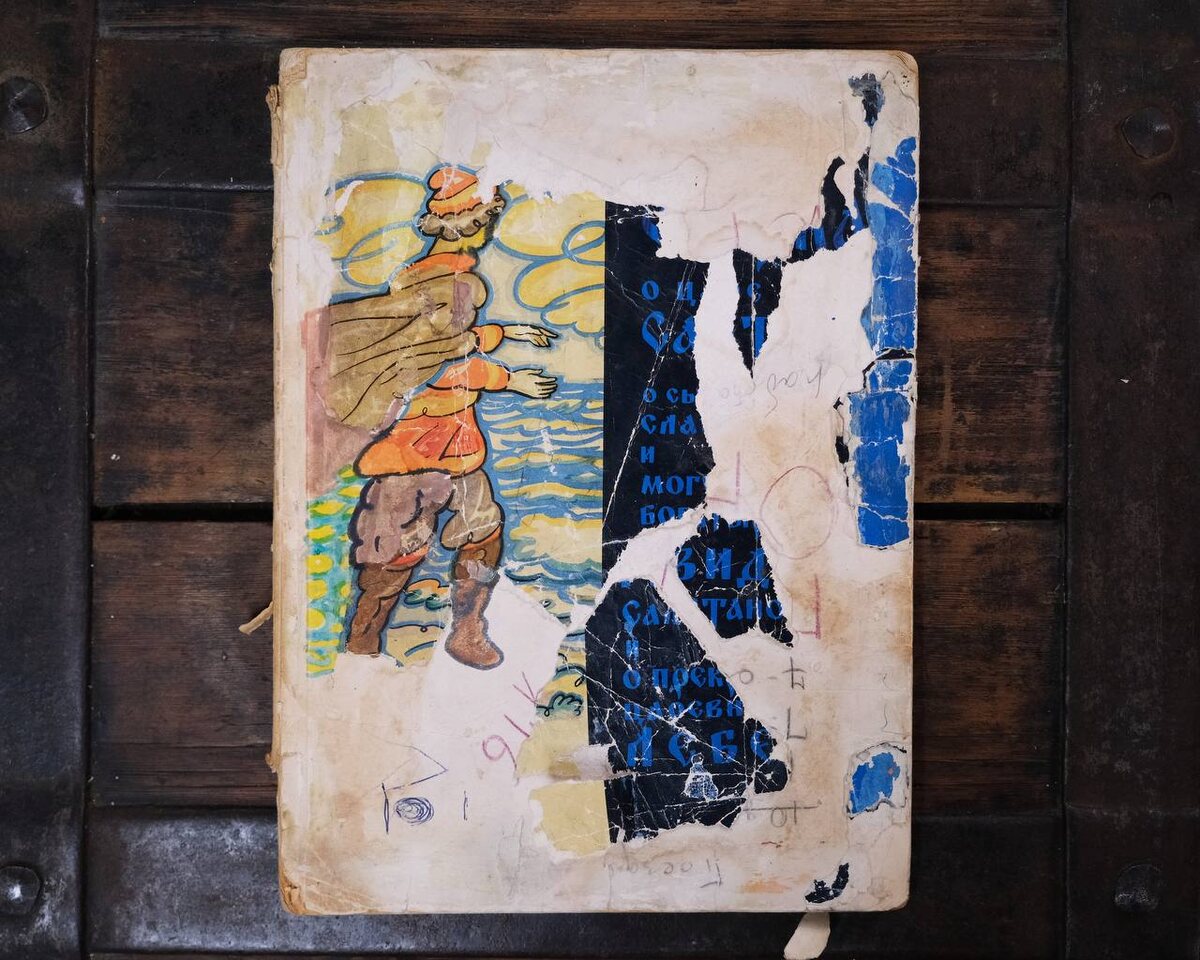 Об А.С. Пушкине и его талантливейших произведениях можно писать бесконечно и с огромным удовольствием. Герои Александра Сергеевича живут в волшебных мирах, полных приключений, а каждая сказка несёт замечательный незыблемый посыл: что бы ни происходило в жизни и какие бы плохие люди в ней ни встречались, в конце концов добро всегда победит зло. На сказках Пушкина росли дети и до революции, и в Советском Союзе, растут и в наши дни. Произведения настолько прочно вошли в жизни людей, что ни одно поколение не может представить без них своё детство. Книга, которая у нас в этот раз на реставрации, лишний раз доказывает: во все времена, при любом историческом ходе событий сказки Пушкина так и останутся важным «Сказка о царе Салтане» была выпущена в 1959 году и, хоть издание и не является антикварным, но очень дорого сердцу своего владельца. Переплёт оказался очень изношенным, прочитать название книги и угадать рисунок на передней крышке было невозможно. От корешка же из-за износа и влияния в