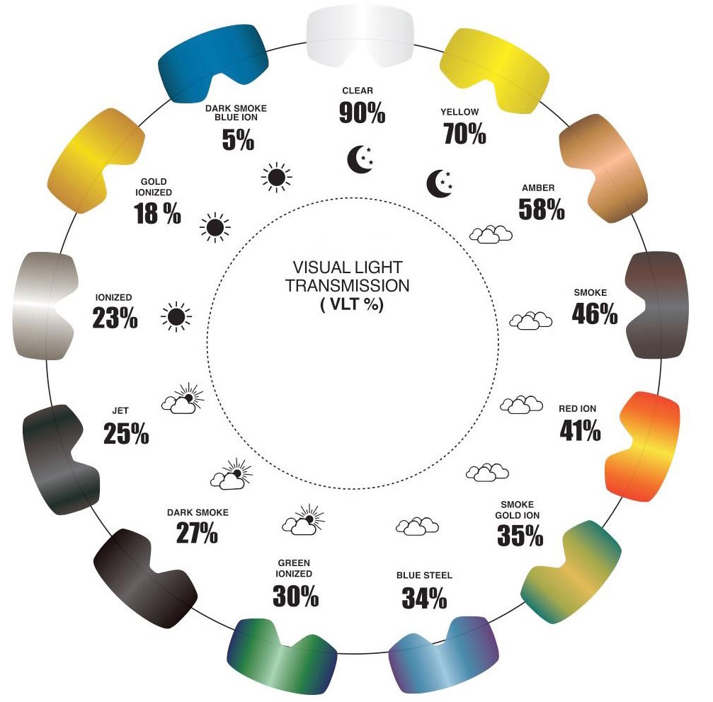 VLT: 5–15%. - Прозрачные линзыМаксимально светопропускающие (VLT: 90–100%).