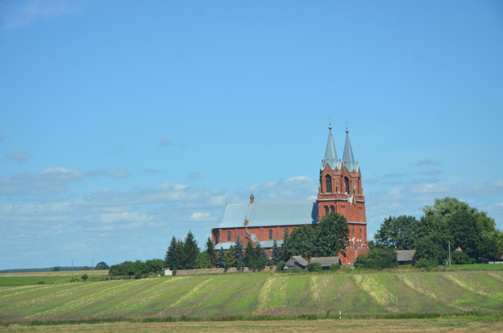 Первый большой костел — в Озёрах, совсем рядом с Гродно. Сильно не заинтересовал, снимаю из машины, едем дальше.