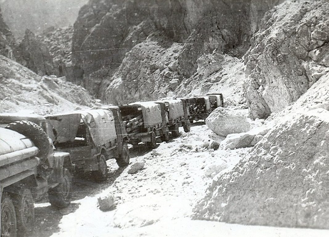 И флагами (алыми советскими, красно-зелёными – афганскими) над маленькими крепостями – боевыми постами дорожной охраны. Мимо этих постов бесконечной чередой, изо дня в день, проплывают и уносятся вдаль автомобильные колонны с грузами. Кажется, Афганистан пересел с ослика на грузовик – устремился в своё будущее…»