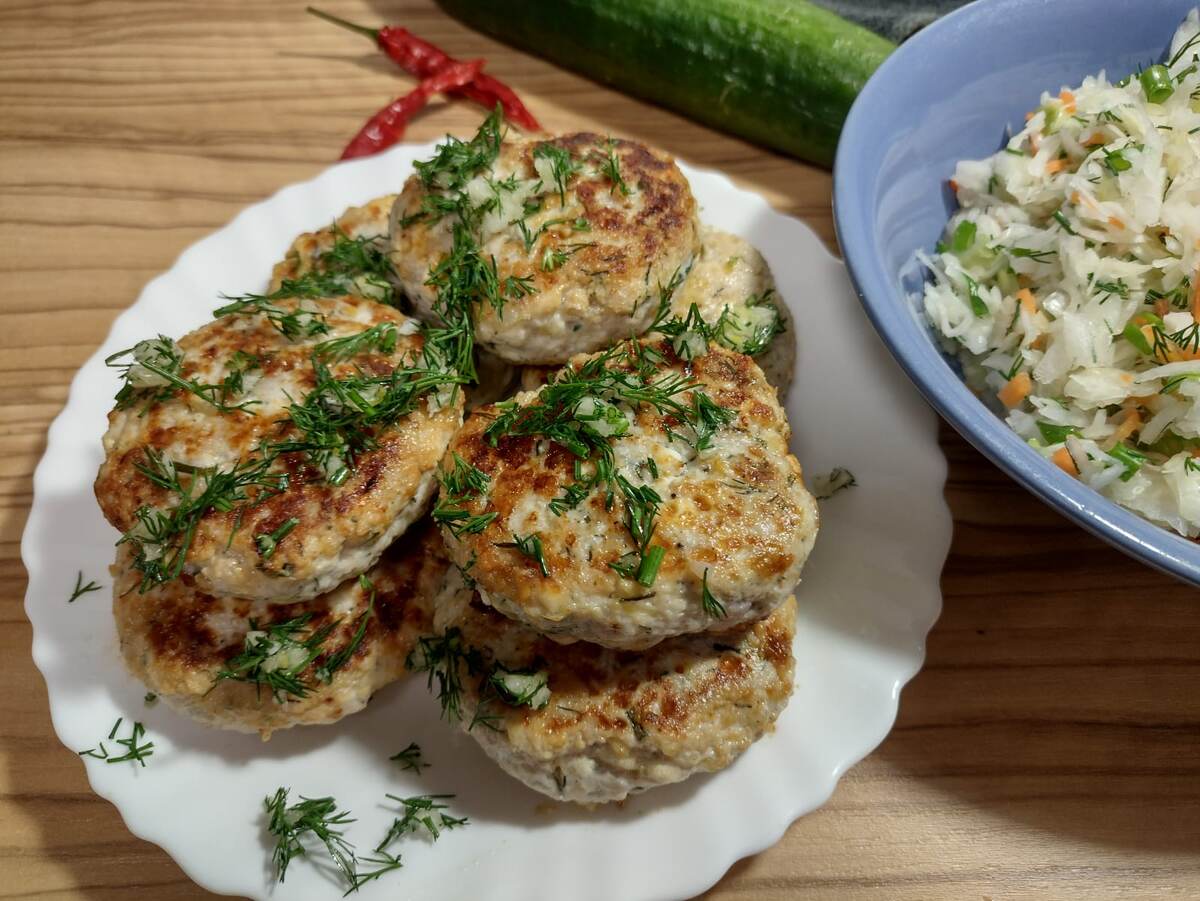 Все ингредиенты тщательно перемешиваем до получения однородной массы. Для придания густоты добавляем 2-3 столовые ложки манной крупы, муки или панировочных сухарей. Вмешиваем укроп, оставив немного для посыпки готовых котлет. Накрыва
