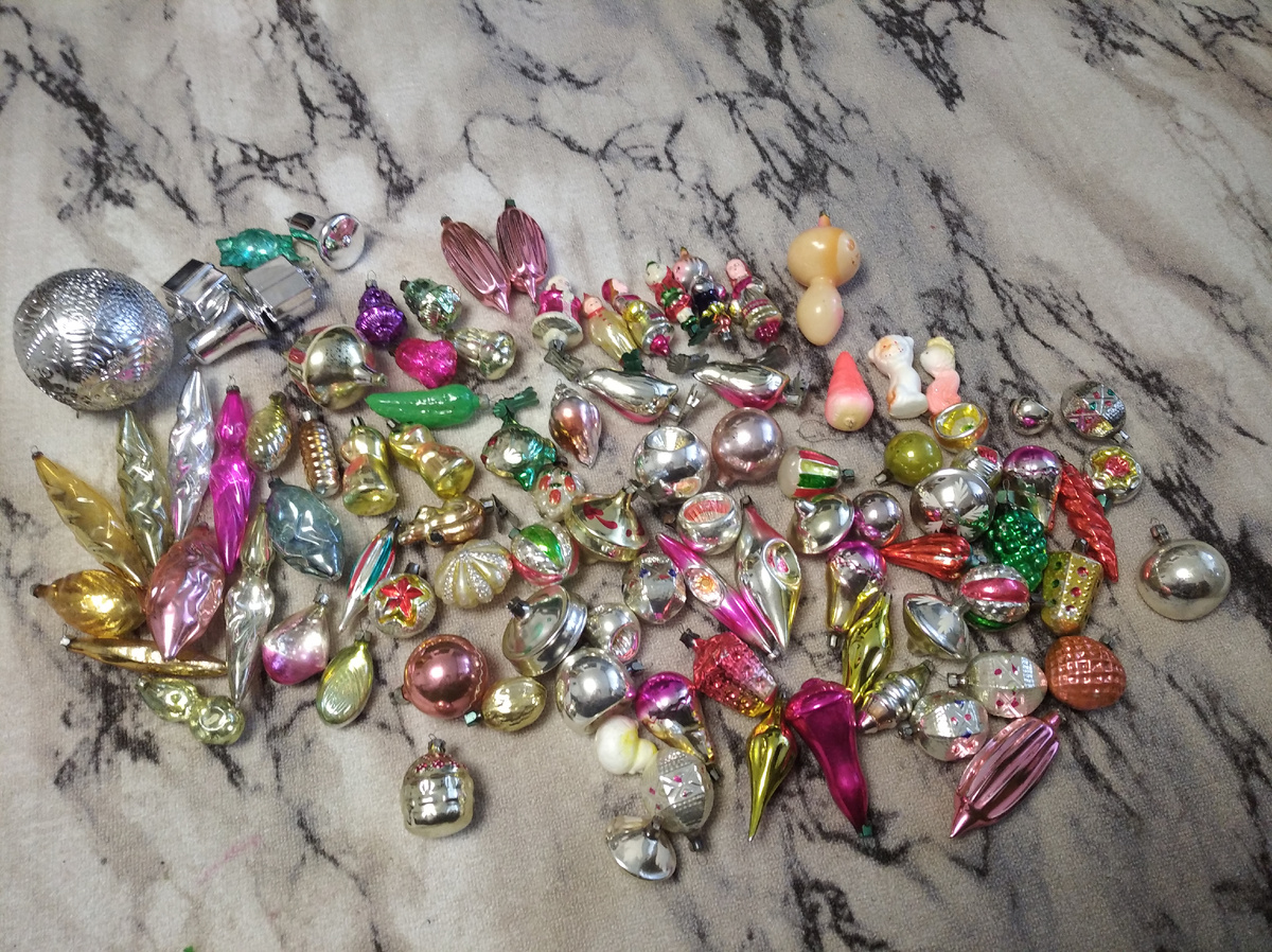 Привет , друзья , хотела с вами поделиться вчерашним прикупом . Пришел на днях дедушка и спрашивает по чем берете ёлочные игрушки . Говорю ну я вам не смогу так сказать , вы принесите , я директору фото отправлю и он скажет сколько готов за них дать. И вот вчера пришел и принес коробку, а у меня полный магазин народу, все что могла просто сверху сфоткать и отправила мужу. Ни пересчитать , ни просто путем рассмотреть времени не было . Муж сказал ничего не понятно , предложи 500 руб Дедушка согласился, сказал пойду бабке винограду куплю. Тоже хочу так в старости ))) когда нам с мужем будет лет по 80 ,что бы как только у мужа заводилась лишняя денежка, склероз ему не мешал купить мне конфет или винограду зимой ))). Вобщем это уже дома все разложила и вам показываю Это поближе Ну вот как то так, друзья , сегодня в обед разнесла 11 заказов , и на завтра пока 4 , дописываю статью, мальчишек накормила( мужа и сына) , пошла паковать дальше ))). И жду вас в нашей поболталке обсудить эту