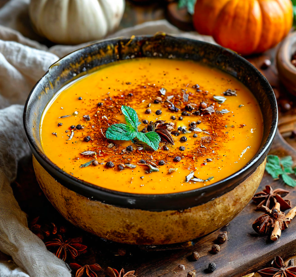 Рецепт : Крем-суп из запеченной тыквы с кокосовым молоком и специями