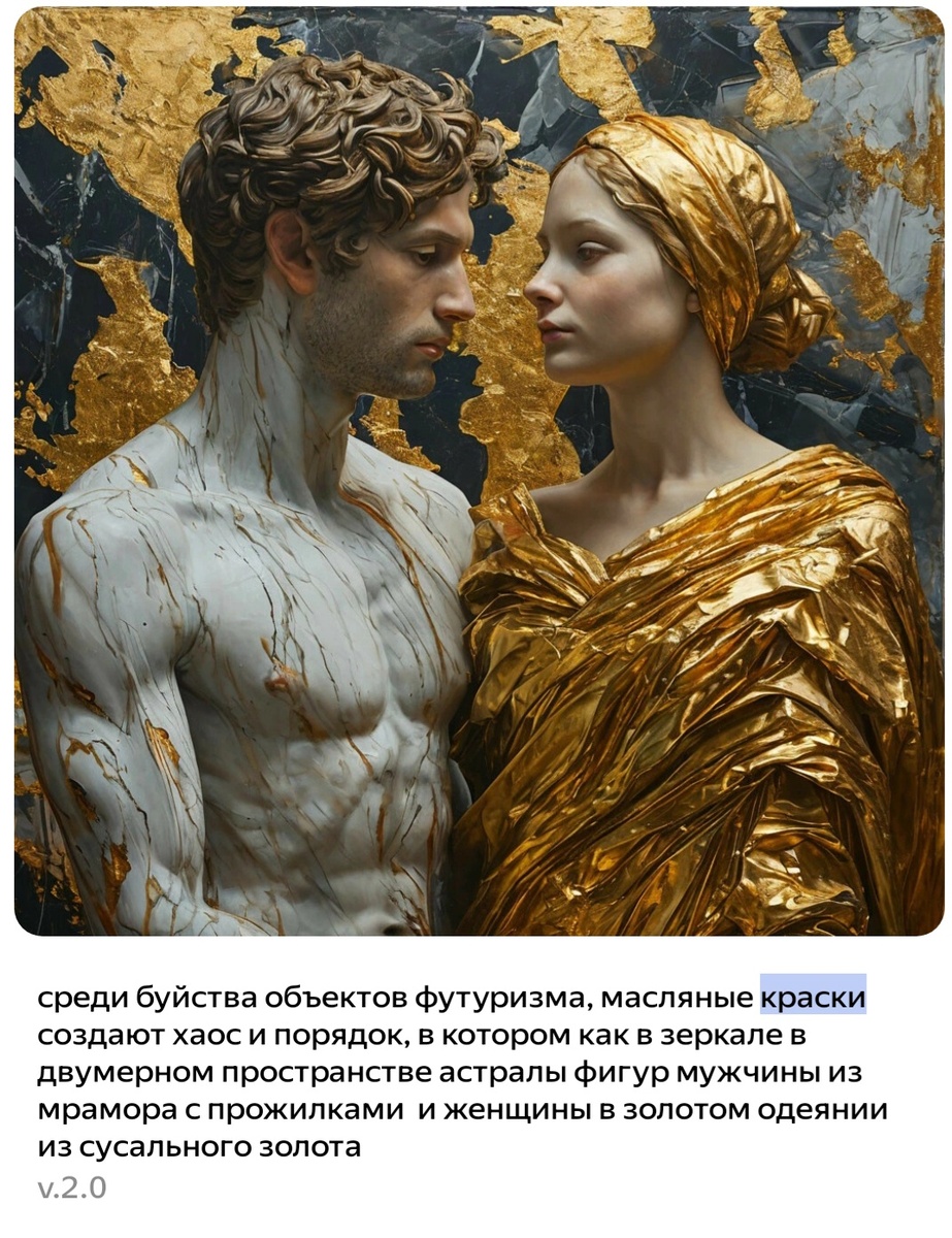 Мы продолжаем наши экспериментами со стилями и инструментами в Шедеврум. Для меня это очень увлекательное занятие, однако узнали, что не всегда нейросети выдают то, что нужно художнику для выполнения реальных заказов. Недавно поступил заказ, где надо нарисовать картину маслом, где лось борется с волками, а одного волка на рога закинул. Как ни задавали эту тему в Шедеврум, всегда одно: лось в окружении волков и все просто стоят, смотрят друг на друга. Пришлось посмотреть много видео и изобразить картину самостоятельно, сделать несколько набросков. Но у нас другая тема, более понятная Шедевруму. Этот промт хорошо получается с любыми объектами. Остаётся прописать ракурс объекта, вид и фон. Буйство объектов футуризма не присутствует на рисунке, может это условие должно стоять в конце запроса, поскольку в начале идёт обычно описание главных объектов. Никак не ожидала, что искусственный интеллект так хорошо понимает футуризм. Двумерное пространство и море удачно соединились. Стиль одежды г