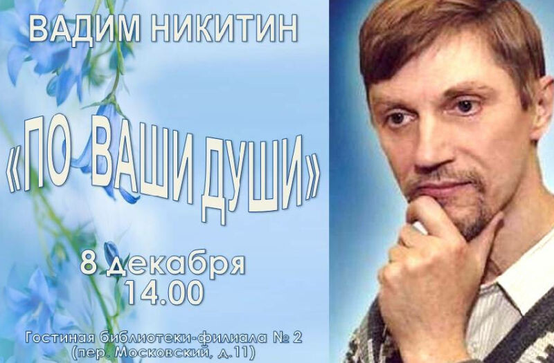 В воскресенье, 8 декабря, в библиотеке-филиале № 2 (пер. Московский, д.11) состоится творческая встреча с поэтом Вадимом Никитиным. Начало в 14:00. Вход свободный. К сожалению, в связи с самочувствием, сам Вадим Александрович не сможет присутствовать на встрече. Коллектив библиотеки обращает внимание на то, что по согласованию с Вадимом Александровичем это будет не традиционный ежегодный авторский вечер, приуроченный к его дню рождения.