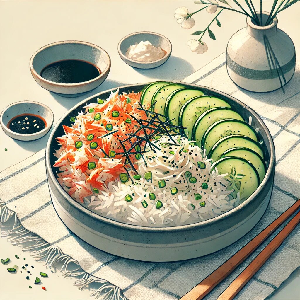В последнее время я увлеклась изучением правильного питания и решила попробовать готовить салаты и так называемые боулы. Для тех, кто не знаком: боул — это блюдо, подающееся в глубокой тарелке или чаше, которое сочетает разнообразные ингредиенты. Обычно это овощи, злаки, белки (курица, рыба, бобовые) и различные заправки или соусы. Боулы ценятся за универсальность и возможность подстраивать их состав под свои вкусы и потребности. Кроме того, они отлично подходят для сбалансированного и питательного рациона. Боулы могут быть выполнены в разных стилях — от азиатского до средиземноморского или мексиканского, — каждый из которых раскрывает свою уникальную вкусовую палитру. И вот мой первый эксперимент с боулом! Я решила начать с простого и использовала продукты, которые почти всегда есть дома: 2. Мелко нарезала крабовое мясо и смешала его с творожным сыром. 3. В эту смесь добавила измельченные листы нори и всё тщательно перемешала. 4. Огурец нарезала мелкими кусочками. 5. В глубокой тарел