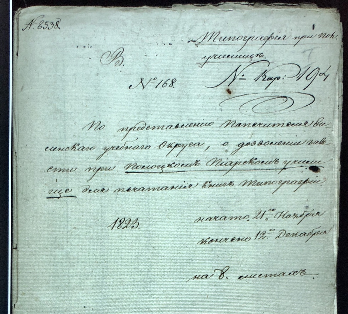Принимая в уважение, что по Высочайшему повелению все учебные пособия и прочие принадлежности, оставшиеся в Белорусских губерниях после высылки иезуитов всемилостивейше предоставлены на употребление тамошних училищ, а потому что заступившие в Полоцке место иезуитов ксендзы пиары, получив при Полоцком училище между прочим и типографию, имеют право содержать и употреблять оную по надобности, честь имею просить дозволения Вашего Сиятельства на заведении при Полоцком училище типографии для печатания учебных и других книг, с тем чтобы поелику Полоцкое училище состоит на степени гимназии, то предоставлено было бы Смотрителем онаго,